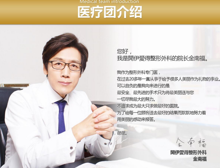 现在开伊爱得整形外科院长是金南福教授,他过去20多年一直从事于美容整形行业,以最安全、最先进的手术为用户带来最大限度的美丽,并且他在美容整形领域取得过诸多荣誉,如: