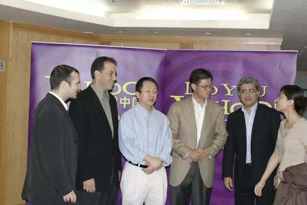 (雅虎收购3721时的照片,左二起:雅虎全球COO Dan Rosensweig,周鸿祎,杨致远,雅虎CEO Terry Semel,Lake Dai)