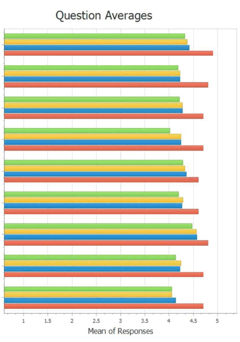 (Lake的课程得分与CMU全校及分院平均分的对比,红色代表Lake,纵轴代表课程设置、教学内容、课堂沟通等不同维度)