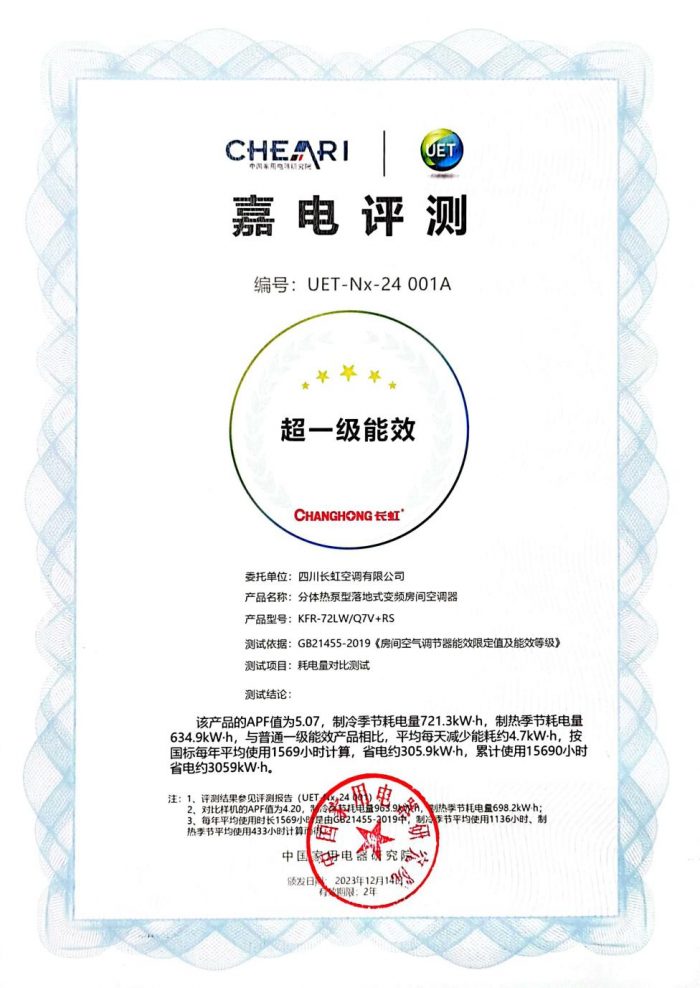 普通一级能效柜机的能效比为4.2,长虹巨能省柜机能效比高达5.0,比普通1级能效每天可节省4.7度电,按照国标每年平均使用1569小时计算,可节省305.9度电,10年可节省3059度。凭借优秀的能效表现,巨能省荣获了中国家用电器研究院颁发的首张空调行业舒适风空调超一级能效证书。