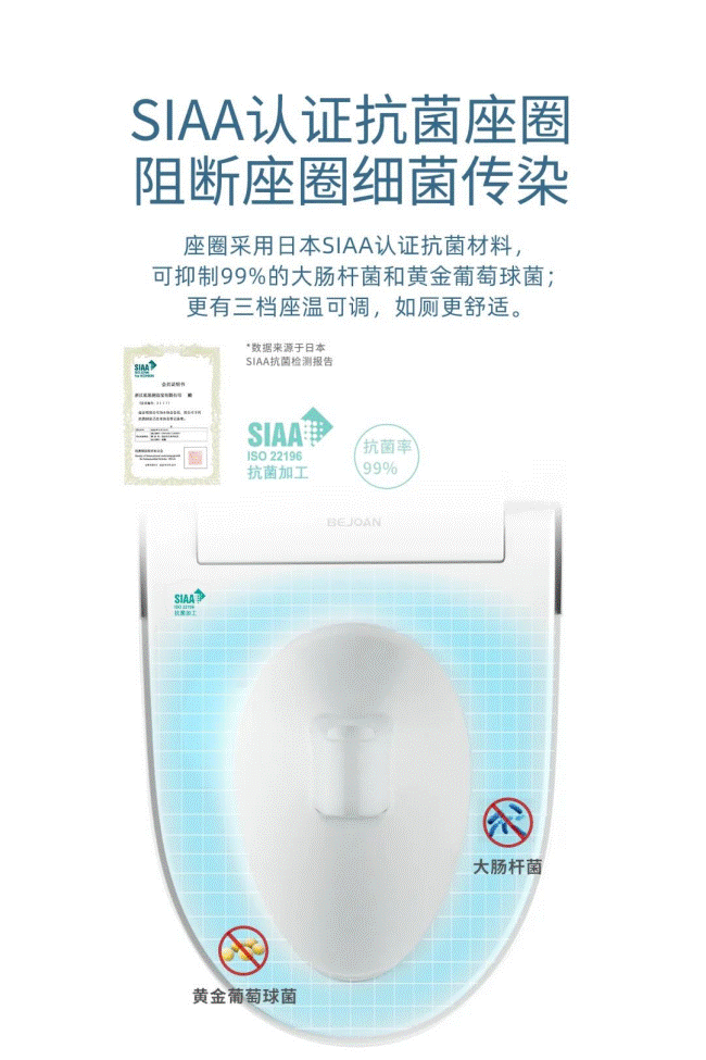 便洁宝T20系列带来的不只有洁净,还有安全和健康。不仅配备了多种水洗、暖风烘干、活水即热等功能,便洁宝T20pro智能马桶还搭载了超洁净的“光净盾”,长期守护如厕健康。“光净盾”配以紫外线杀菌技术,在强效双重过滤后,清洗用水除菌率高达99.99%,直达饮用水标准。