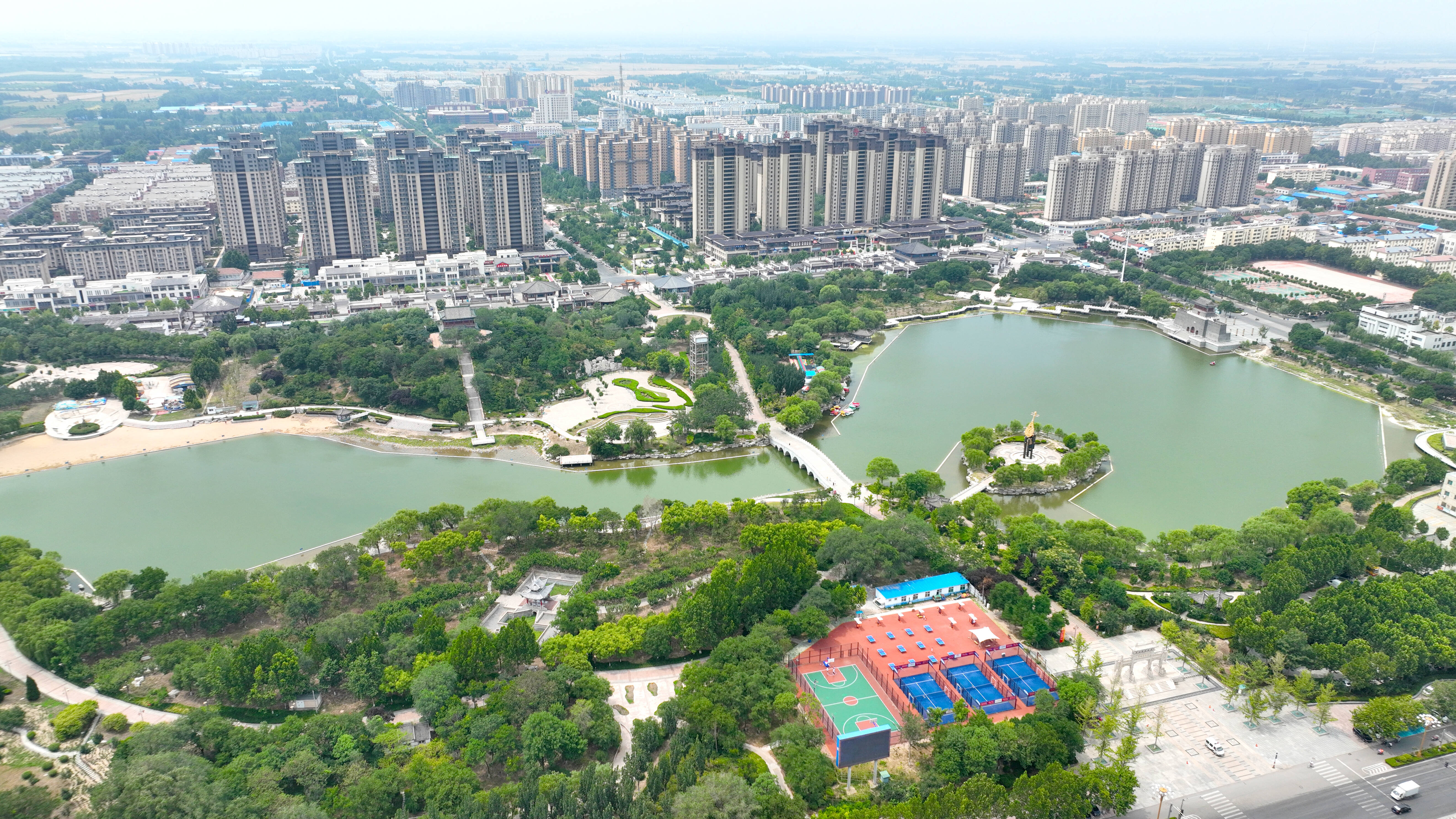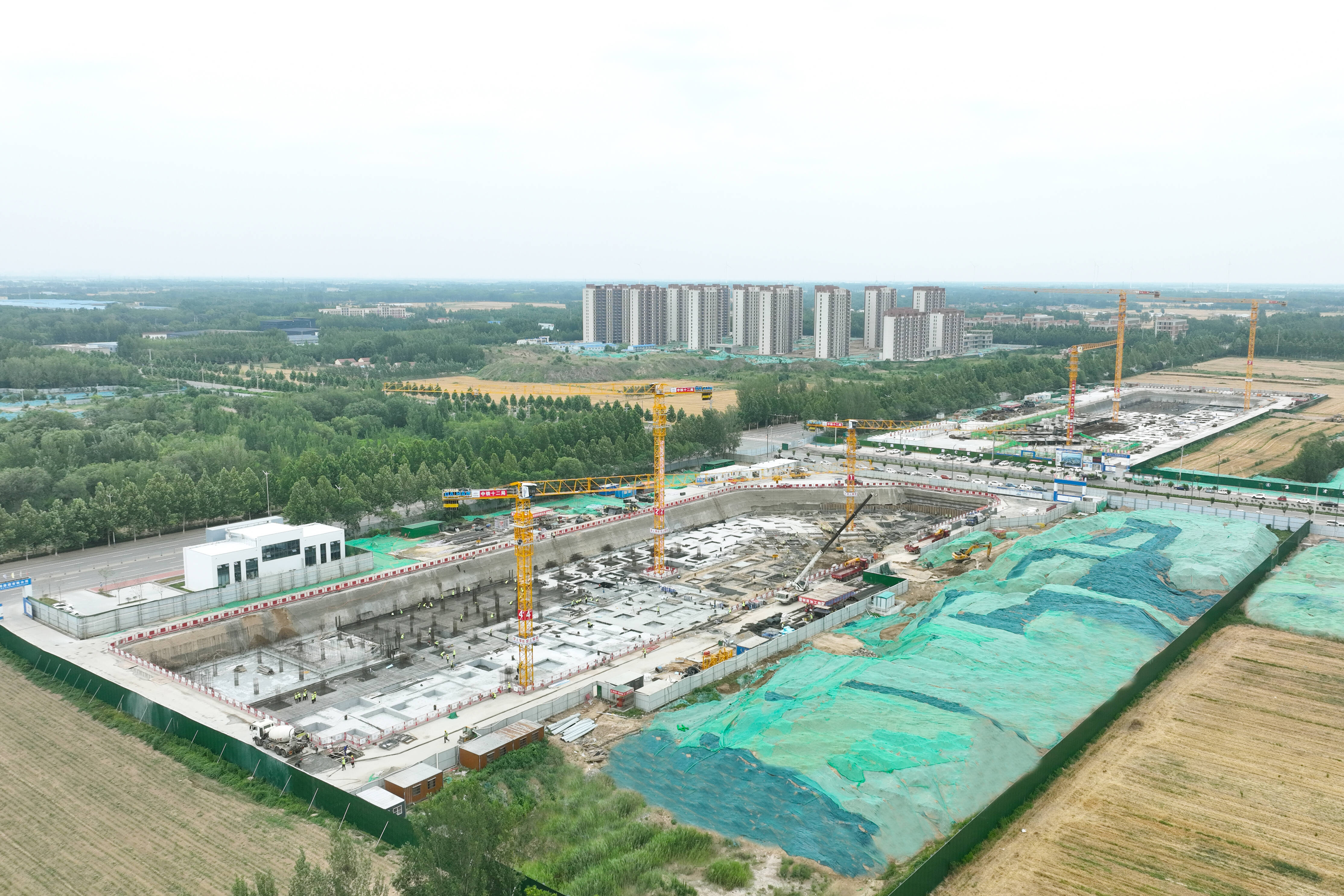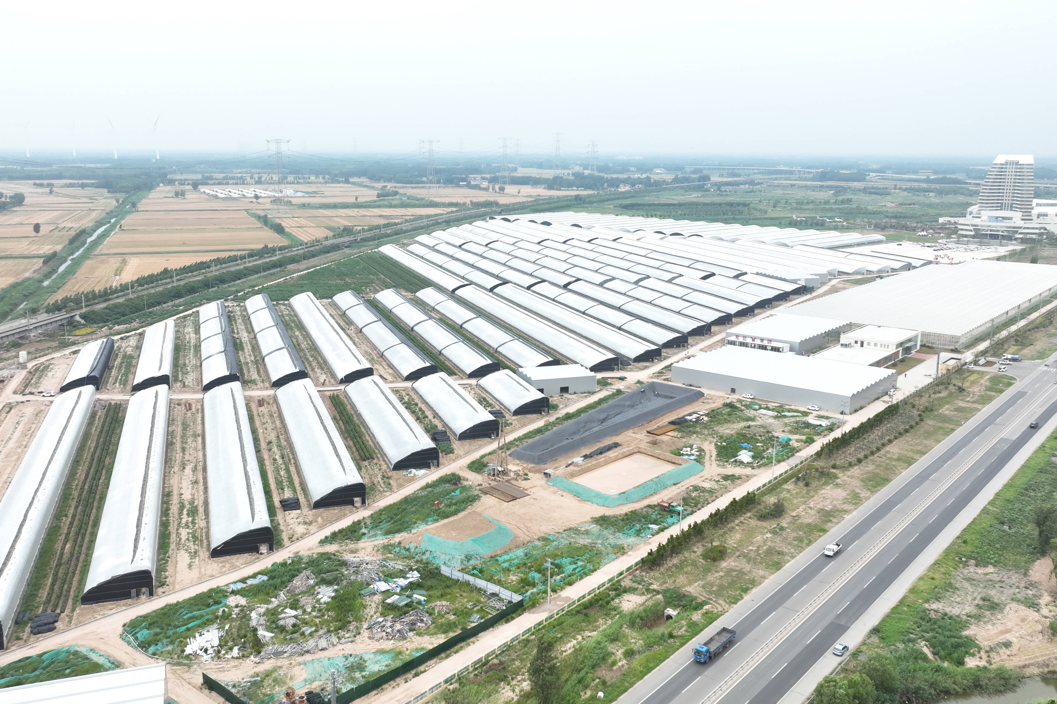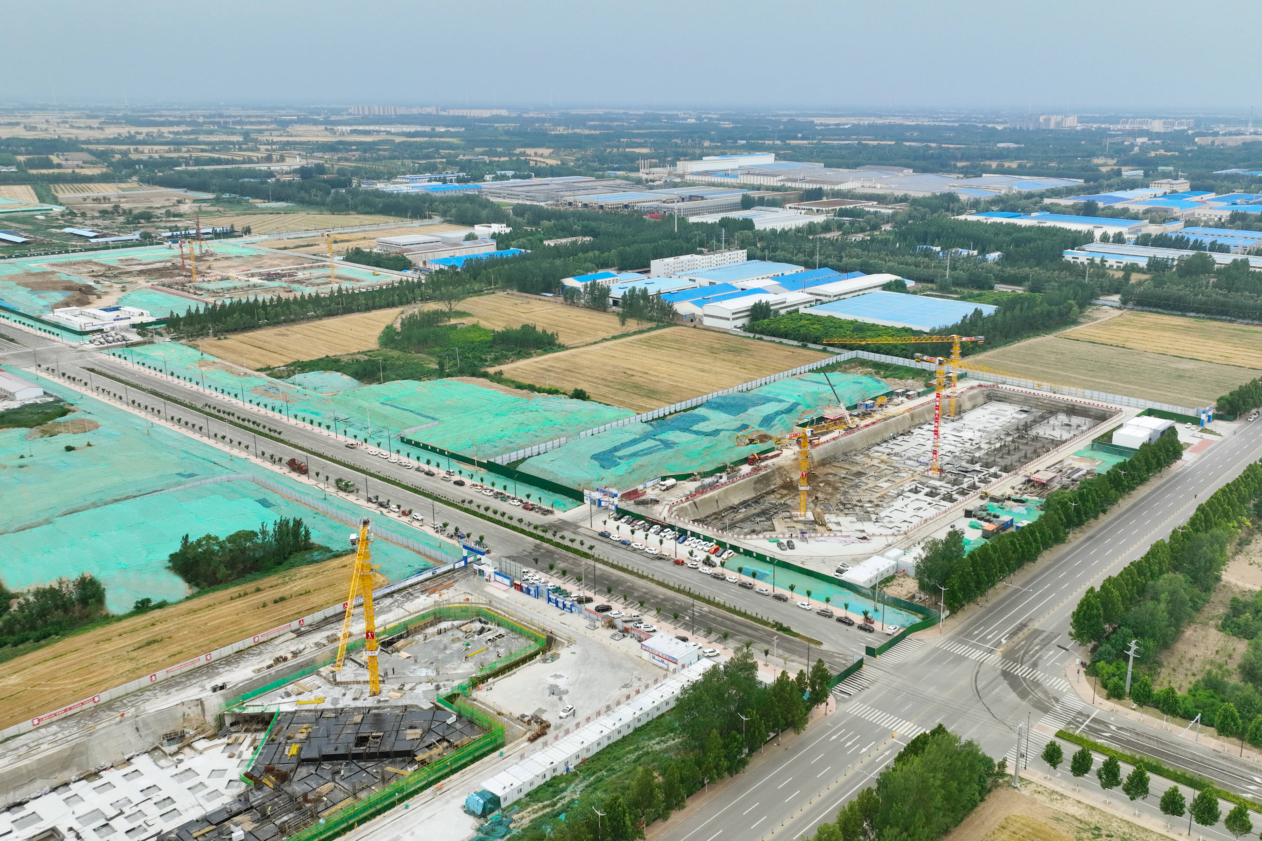 目前,园区“四横两纵”6条道路及市政管网施工完成;水质净化厂、食谷科创中心桩基施工;同福项目永久性围墙施工。