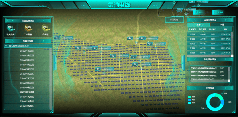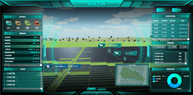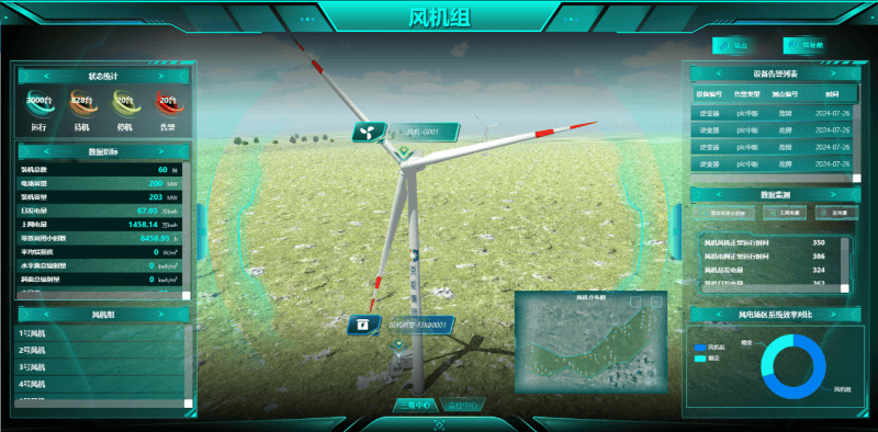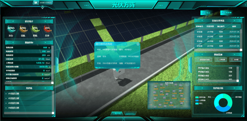 亮点一:1:1仿真复刻,细节致胜依托高精度三维建模与现场实拍贴图技术,系统实现了与物理场站99%的相似度。不仅是设备外观,从660台组串式逆变器的布局到60台海装风机的姿态,每一处细节都在数字世界中被精准还原。这种“亲临现场”的沉浸感,为远程巡检与诊断奠定了视觉基石。